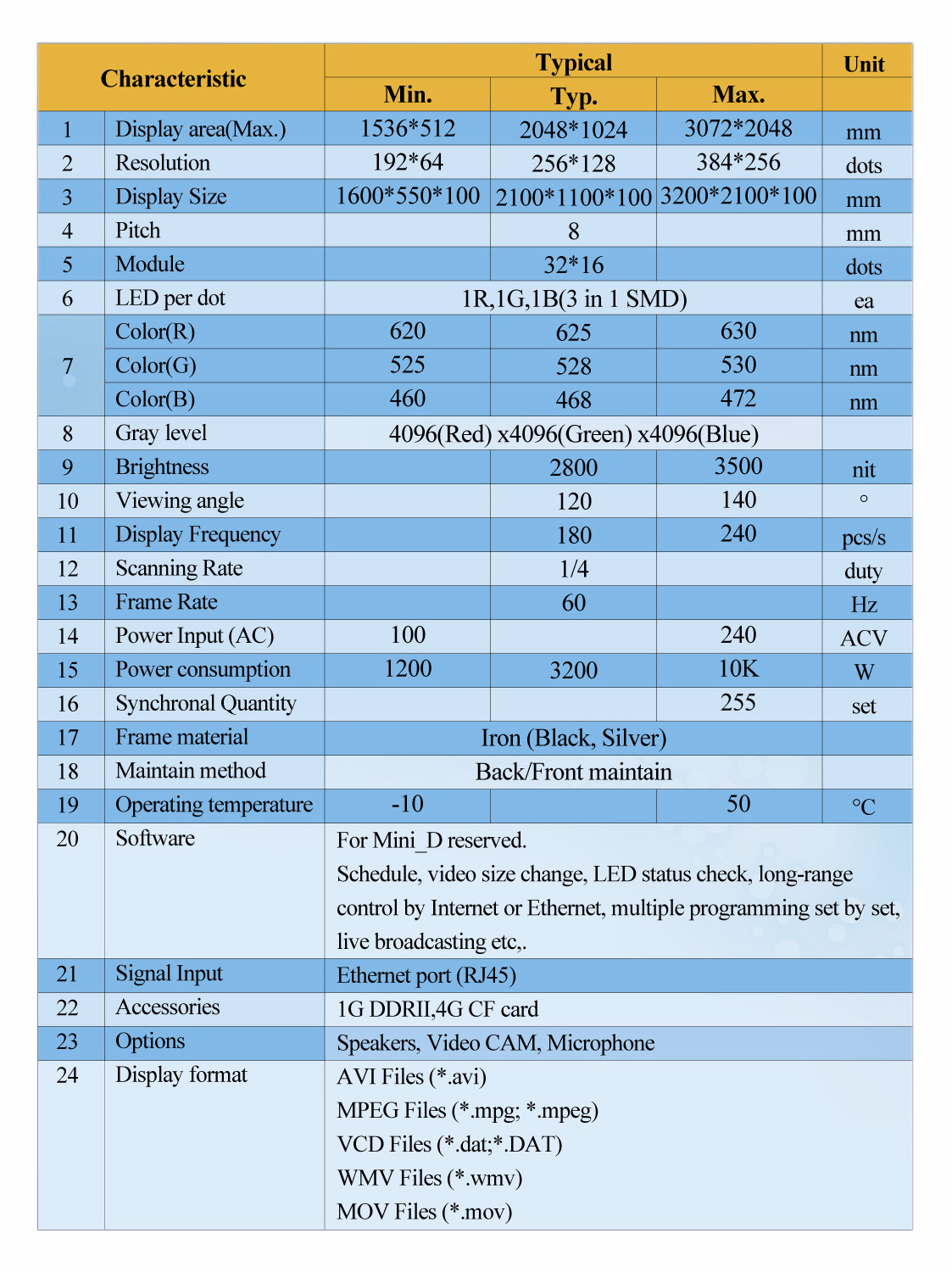 本產品採用高解析度(8mm間距)、高色階(12bits/color)、多工影像效果規劃模式(如Gamma、 Brightness setting)等具產品區隔特性的設計。同時,mini_D為提供客戶不同的解決方案,除了一般LED顯示屏中必須使用一台編輯電腦進行各項影像播放功能之外,mini_D亦提供One touch解決方案,客戶只要將欲播放之影片或動畫檔案存入隨身碟之後,插入mini_D提供的USB插槽後,每日固定時間開啟電源即可立即播放之無PC架構